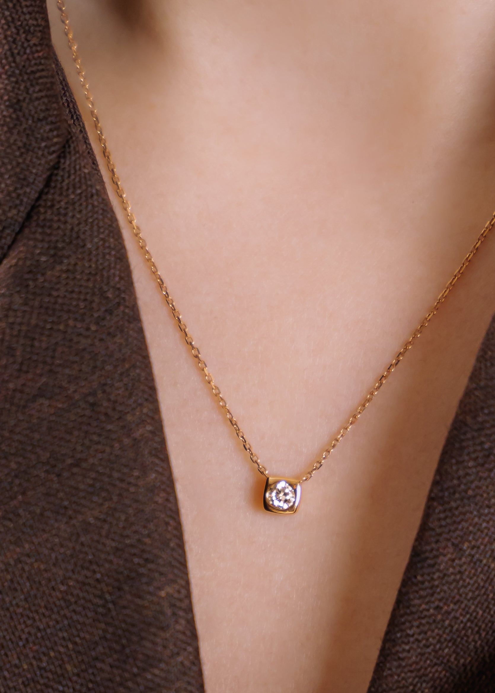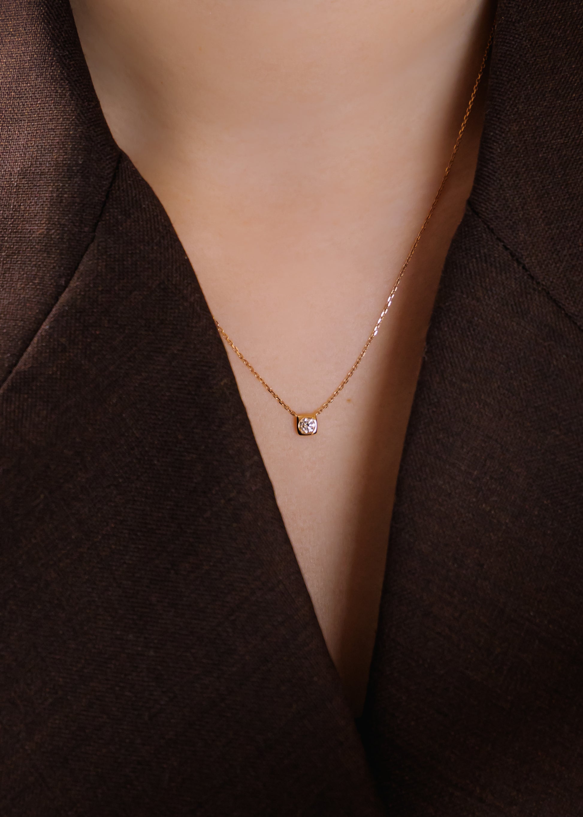 經典的款式永不過時,單顆鑽石的項鍊更是好搭配的日常單品。優雅的圓型鑽石搭配包鑲的設計,有放大整顆鑽石的效果,金屬部位設計為圓角方形的圖案,更加凸顯個性!另外搭配淡淡的玫瑰金鏈條,注重細節才是散發魅力的小心機。